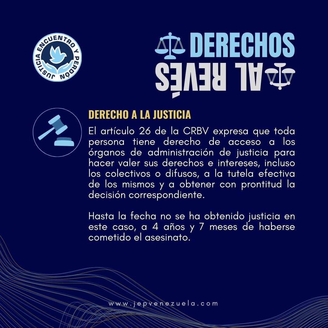 Toda persona tiene derecho de acceso a los órganos de administración de justicia para hacer valer sus derechos e intereses, incluso los colectivos o difusos, a la tutela efectiva de los mismos y a obtener con prontitud la decisión correspondiente. Hasta la fecha no se ha obtenido justicia en este caso, a 4 años y 7 meses de haberse cometido el asesinato.