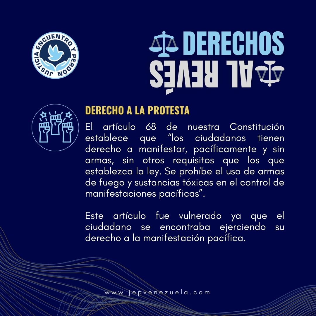 El artículo 68 de nuestra Constitución establece que “los ciudadanos tienen derecho a manifestar, pacíficamente y sin armas, sin otros requisitos que los que establezca la ley. Se prohíbe el uso de armas de fuego y sustancias tóxicas en el control de manifestaciones pacíficas”. Este artículo fue vulnerado ya que el ciudadano se encontraba ejerciendo su derecho a la manifestación pacífica.