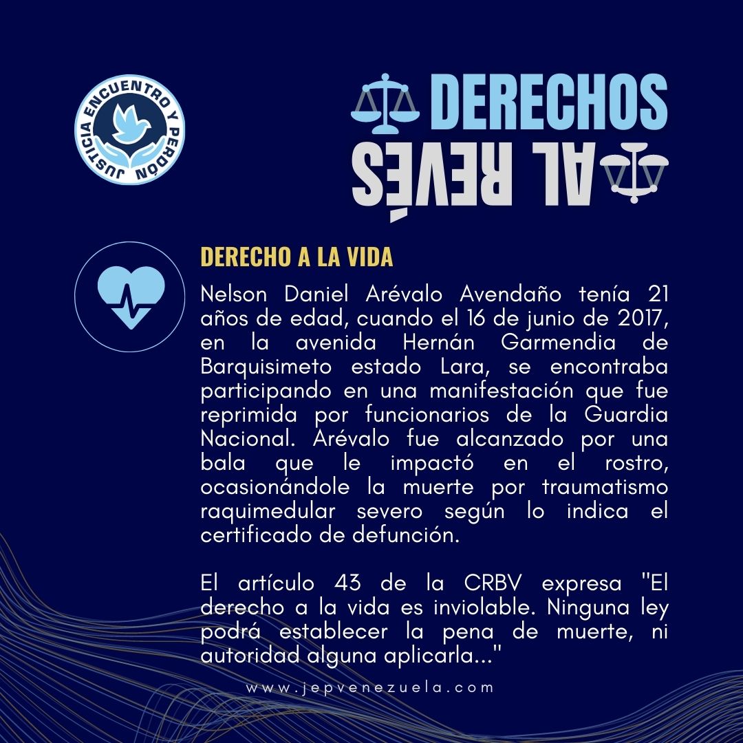 Nelson Daniel Arévalo Avendaño, 21 años de edad. El 16 de junio de 2017, en la avenida Hernán Garmendia, Club Hípico Las Trinitarias, de Barquisimeto estado Lara, se encontraba participando en una manifestación, cuando fueron reprimidos por funcionarios de la Guardia Nacional, siendo alcanzado por una bala que le impactó en la cara, ocasionándole la muerte por traumatismo raquimedular severo según lo indica el certificado de defunción.